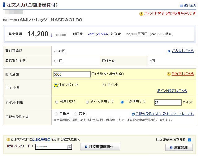 こどもの日で祝日ですが昨日「Vポイント」入ってたので「auAMレバレッジNASDAQ100」へ