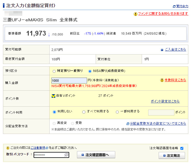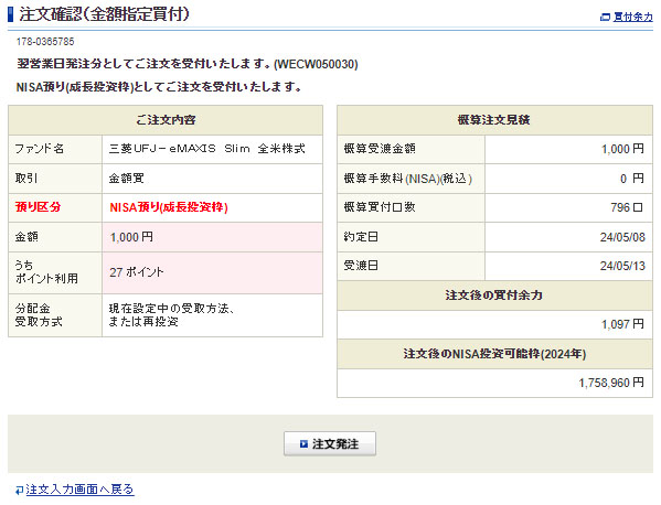Vポイントが入ったのでeMAXIS Slim 全米株式を1,000円分追加|2024.5.5 同じく「eMAXIS Slim 全米株式」へ・・・こちらは1,000円分です。 やはりポイントは半分の27ポイントを利用。これで「すべて利用する」です。 ※「利用しない」で注文をしました こちらは「NISAの成長投資枠」での運用です。 NASDAQと同じく全米も調整局面。こちらはレバではないので波は穏やかですが上がったり下がったりを繰り返しの下げ局面。FOMCを受けて週明け以降どうなるか?ですね ※後から気が付いて一度キャンセル後、ポイントを使って買いなおした。 今度は「うちポイント利用 27ポイント」です。