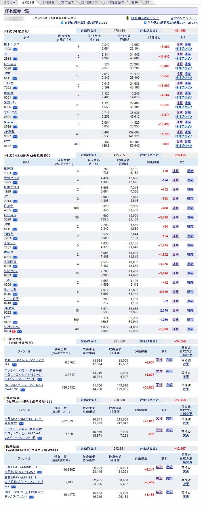楽天のNISA口座はまさしく「塩漬け」。まだ110(+30)をキープしています。