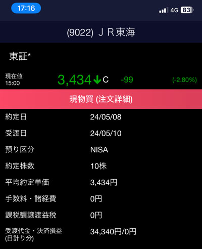 昨日は上げ相場ながら下げていた「JR東海」が今日も下げたら追加購入しようと思っていました。