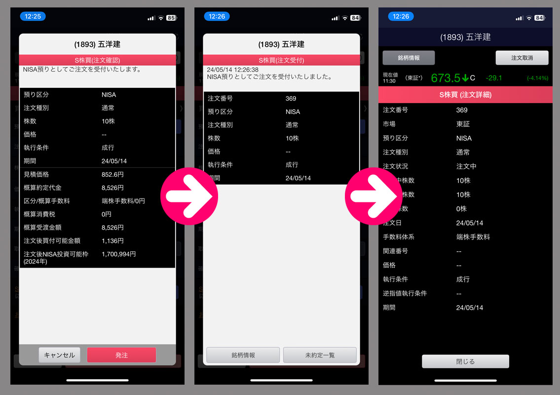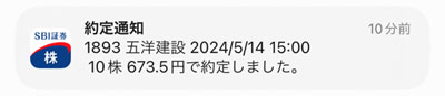 まだ昼休みだったので今日後場の引けの株価で約定です。