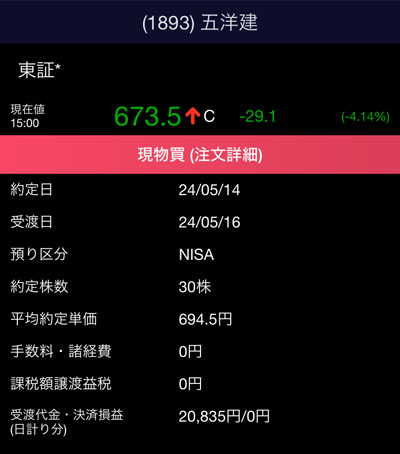 注文時から変わらずの673.5円でした。
