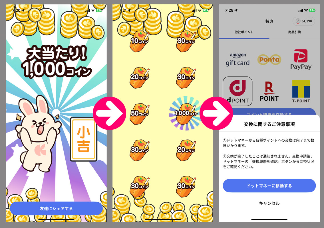 その「おみくじ」ですが早い段階で「小吉」ゲットしてあっさりと33,000を超えました!これは大ラッキー♡そしてまずはドットマネーに変換