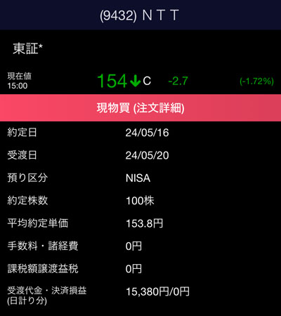 153.8円で約定!100株なので15,380円です。
