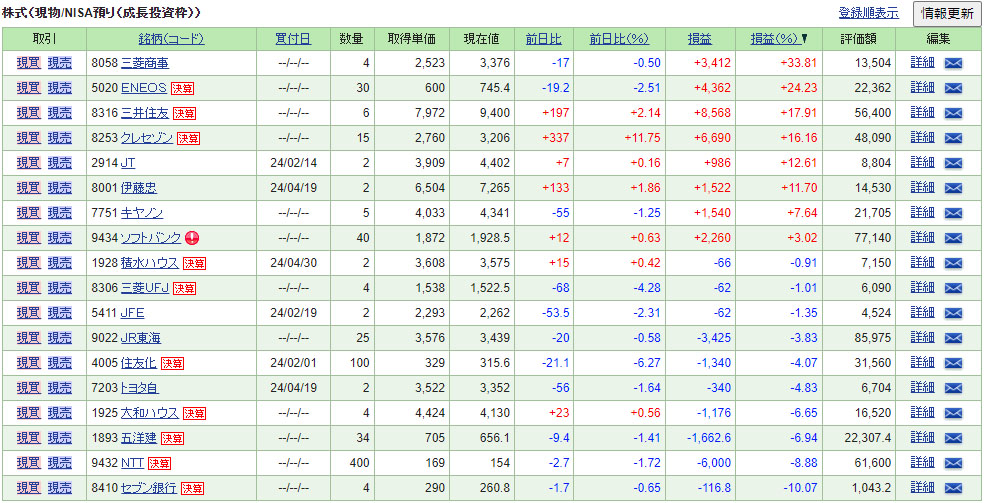 今年に入ってからNISA口座で買い始めた銘柄は半分以上が含み損に。