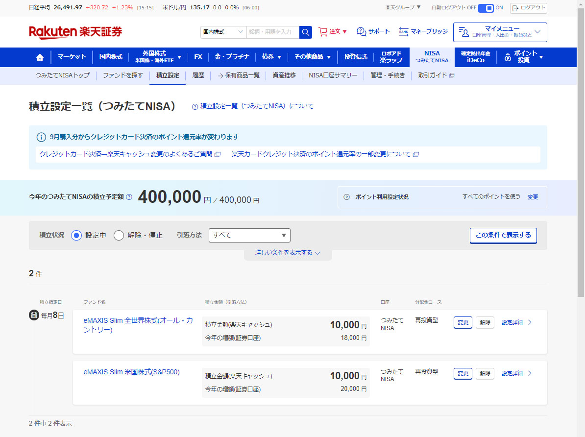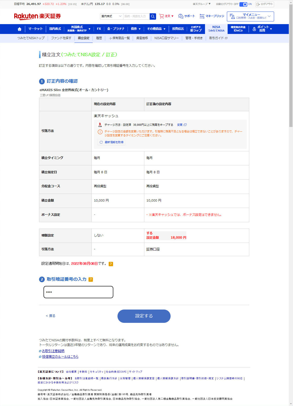 積立の引落決済を「楽天キャッシュ」にするついでに「つみたてNISA」の設定を変更して