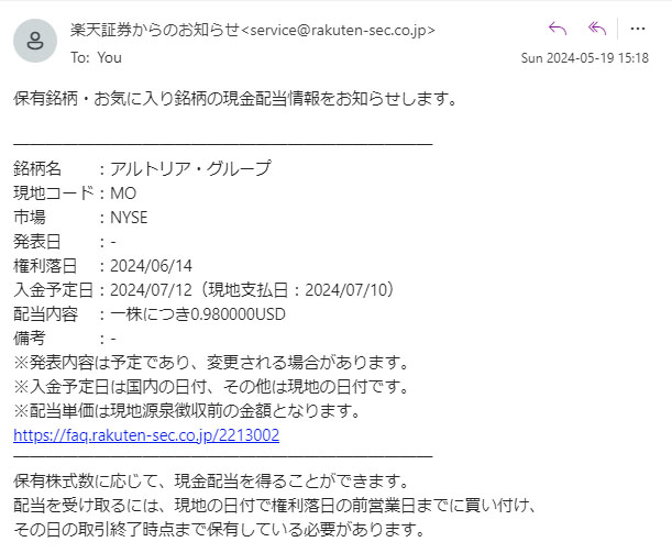 アルトリア・グループ(MO)配当予告 2024.7月分 アルトリア・グループの配当予告メールが楽天証券から来ました。 前回の配当と同じ$0.98なので・・・ $0.98×4株=$3.92 $3.92×0.9=$3.528 $3.528×0.79685≒$2.81・・・ぐらいかとw 前回から2株増えてるので配当も倍増です!