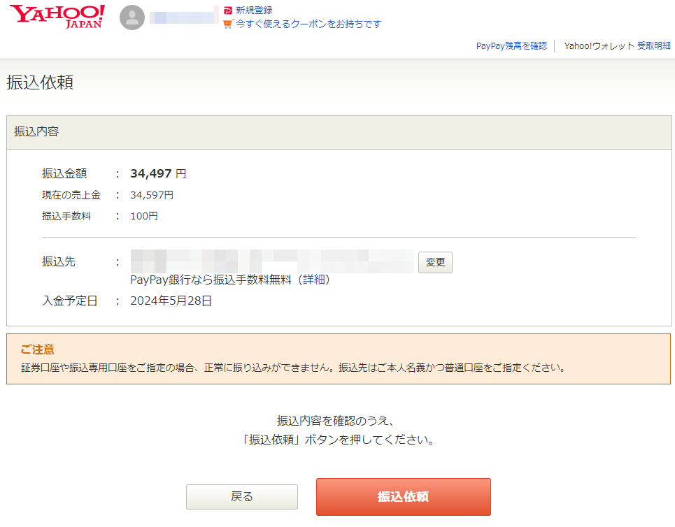 今月は6件の落札で10,764円の収入があり先月分と合計すると34,597円になったので口座へ振り込みの手続きをしました。