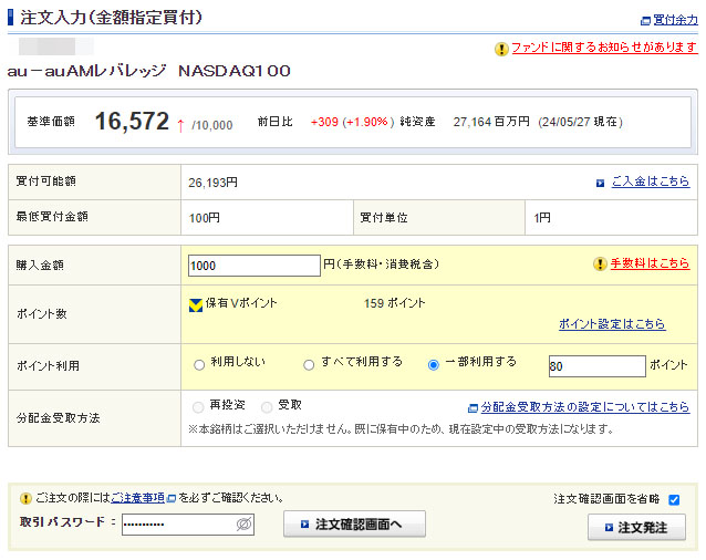5月25日にVポイントが入っていたので「auAMレバレッジNASDAQ100」に1,000円分追加投資しました。