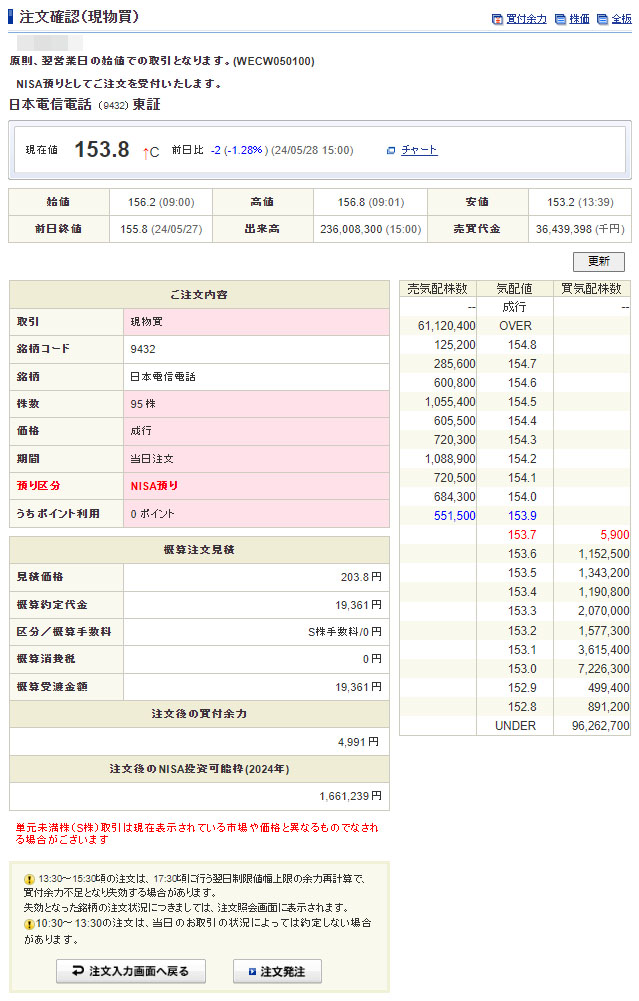 注文時(昨日の終値)より少しだけ下げていました。しかし天下のNTT・・・確かに営業利益は直近四半期で下がっていますがこれ程の株価の下げはないと思いますけど・・・機関が売ってるのだとやはり思います。逆に個人は買い向かってるみたいだしwww