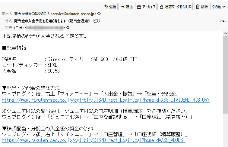 SPXLから配当がありました。2022.7 コメントを残す SPXLの配当が出ました 米国ETFなので投資信託とは違い再投資は手動だったのを忘れていました。 微々たる金額なので再投資するにも1株分の$が必要なのでとりあえずはこのまま放置ですね 朝、メールも届いていました。