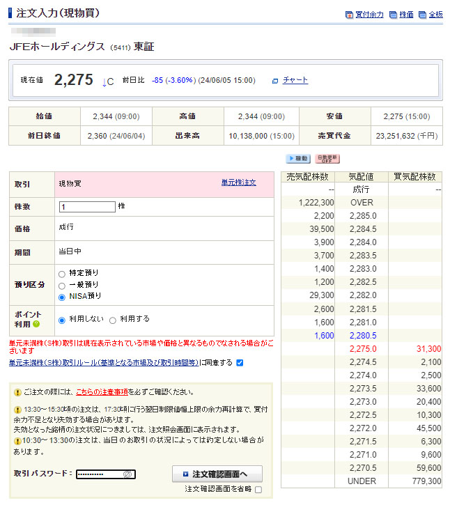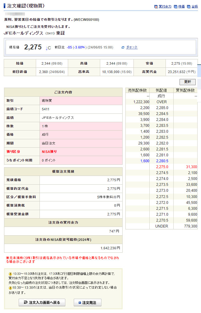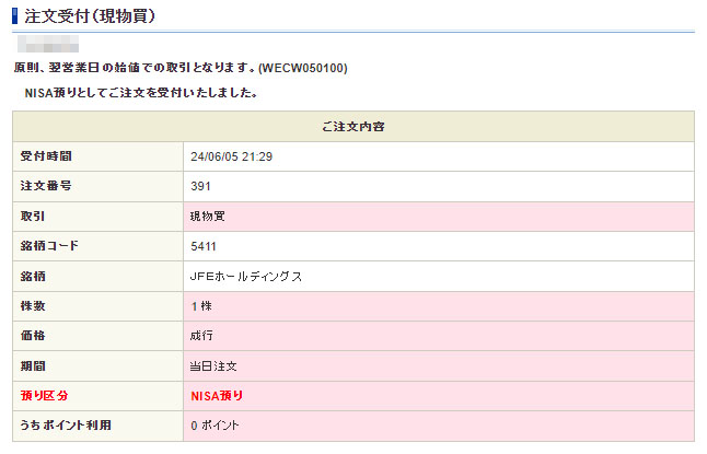 配当が出たオリックスは買えないのでとりあえず購入可能で含み損が出ている「JFEホールディングス」を1株だけ追加する事にしました。