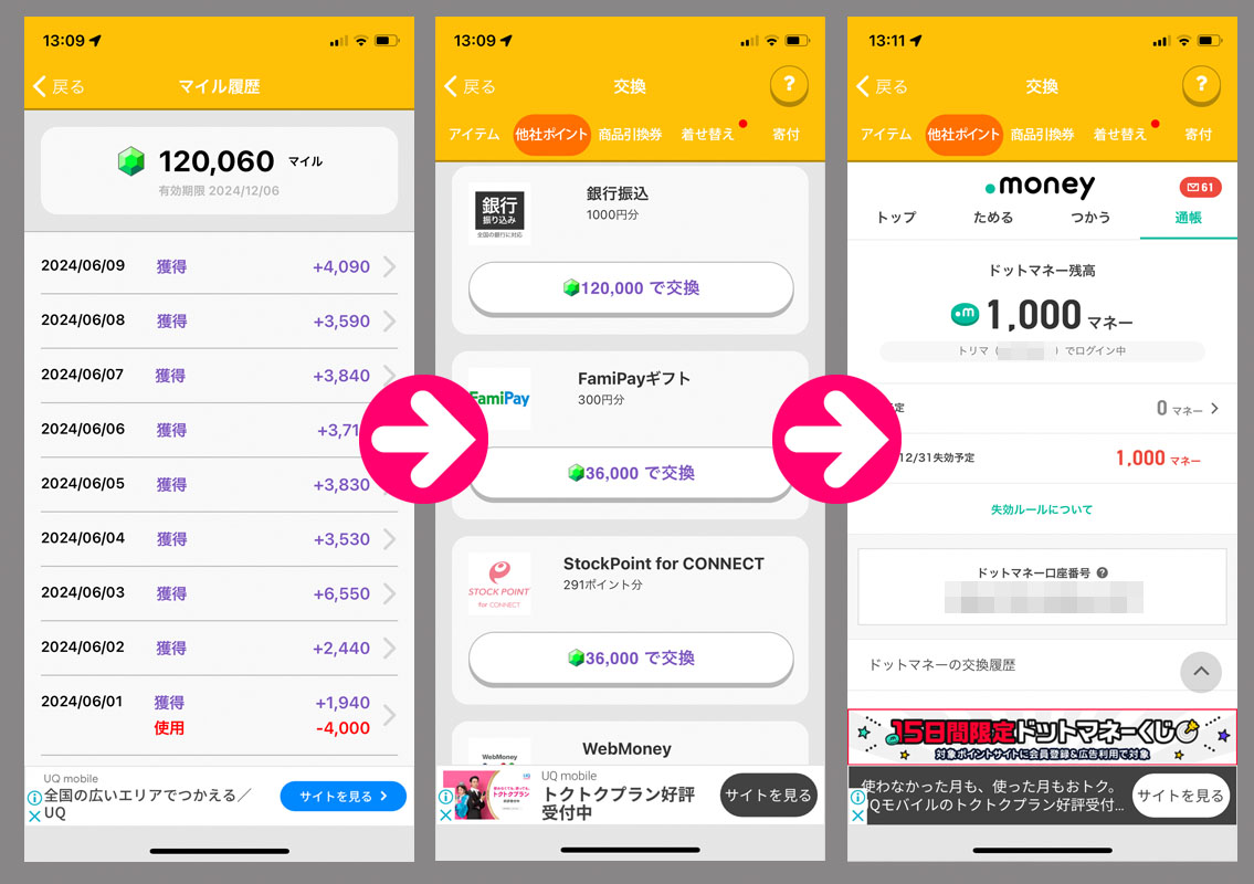 まずは「マイル」を「ドットマネー」に。120,000マイルで1,000ドットマネーになり換金可能となります。