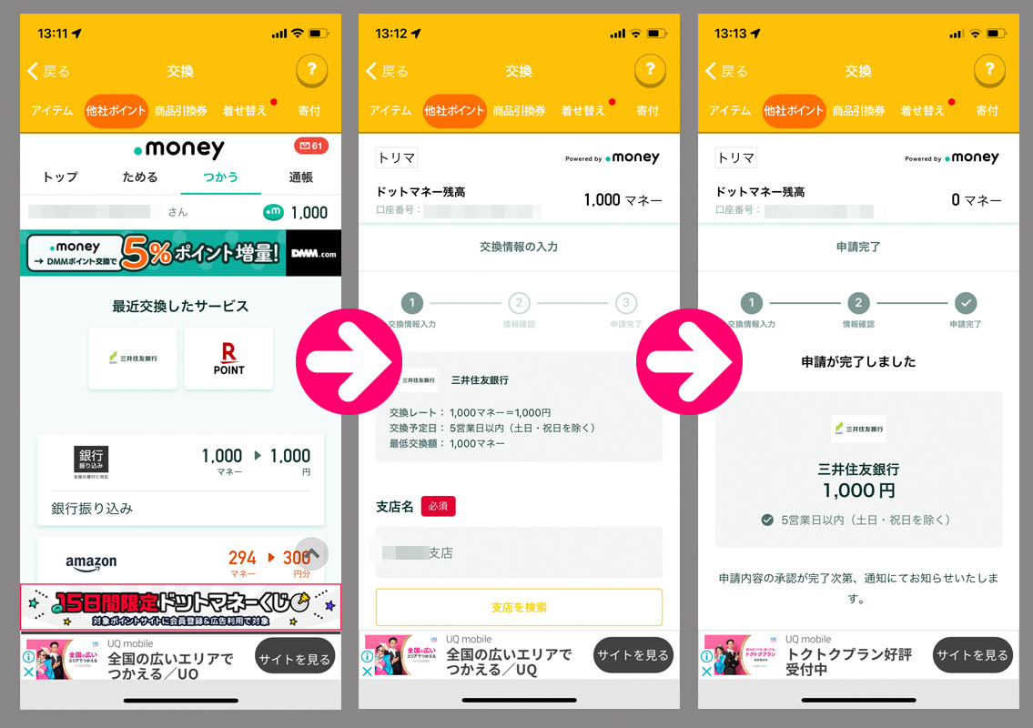 トリマのマイルが120,000に達したのでドットマネーに変換。そして換金の手続きをしました。