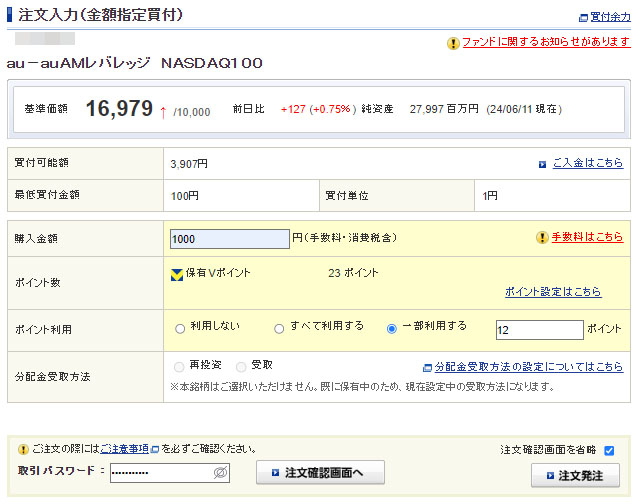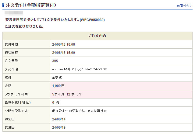 Vポイントが入ったのでauAMレバレッジNASDAQ100を1,000円分追加|2024.6.12 Vポイントが入りましたので「auAMレバレッジNASDAQ100」に何時ものように1,000円分を投入!ちなみに昨晩の米国市場でNASDAQが史上最高値を更新しましたwww 正直こんな時に買うのかよ?って気もします。 今回入ったのはSBI証券の投信マイレージ分で23ポイント。先月から3ポイント増えました! ポイントを約半分を使って口座からは988円。 約定は金曜日(夜)で今週末に間に合うようです。 相変わらずの米国株高、円安ですが。。。他に投資先も思い浮かばないし仕方ないです。