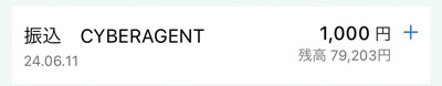 CYBERAGENTから三井住友銀行口座に1,000円の入金。