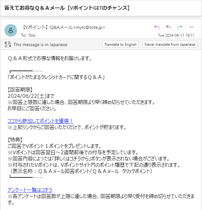 VポイントがTポイントと統合され、それを機会にアプリで設定したら”【Vポイント】Q&Aメール” ってのがちょくちょく来るようになった。