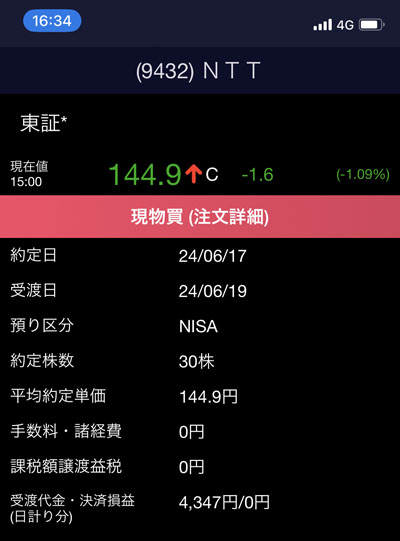 NTTは今回でNISA口座に530株で平均取得単価は165円