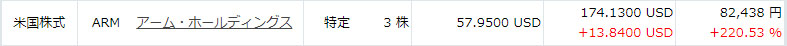 ARM トリプルバガー達成 昨日の米国市場、AI&半導体が続伸してARMも上昇! 今週の上げが凄まじい 遂にトリプルバガー(3倍)になりました。 ホントこんな事ならもう少し買ってれば・・・。 なんとPERは580.43倍・・・笑うしかない 今が売り時なのかもしれませんが1年はホールドすると言って買っていますので。 3株しか持ってないし当分はホールドかな?下がり始めると谷に落ちそうですがwww ところでARMってAIにそれほど寄与してるんですかな?まぁ設計なのでよく分かりませんが。