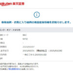 楽天証券からバンク・オブ・アメリカ(BAC)からの配当予告メールが来ました。 前回と変わらず $0.26×30株=$7.8 $7.8×0.9=$7.02 $7.02×0.8=$5.616 で、前回は$5.62でした。 バンカメは高配当銘柄ではないので今の株価での利回りは2.22%です。 私の所得株価からだと3.59%です・・・暴落時に買ったので。 直近の決算 … 続きを読む