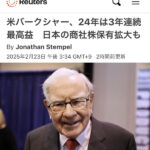株主総会での株主への手紙にあったそうです。 Reuters(米バークシャー、24年は3年連続最高益 日本の商社株保有拡大も 2025.2.23 より転載) バークシャーって現金比率を過去最大にしてたような事をニュースでみてましたがそれでも同期比71%増ってどんな投資してるんだよ!ってなりますが報告書見れば誰でも真似できるんですよね~?まぁやはり凄いとしか・・ … 続きを読む